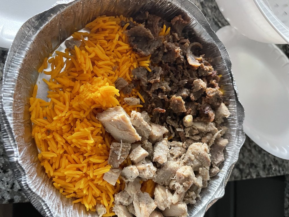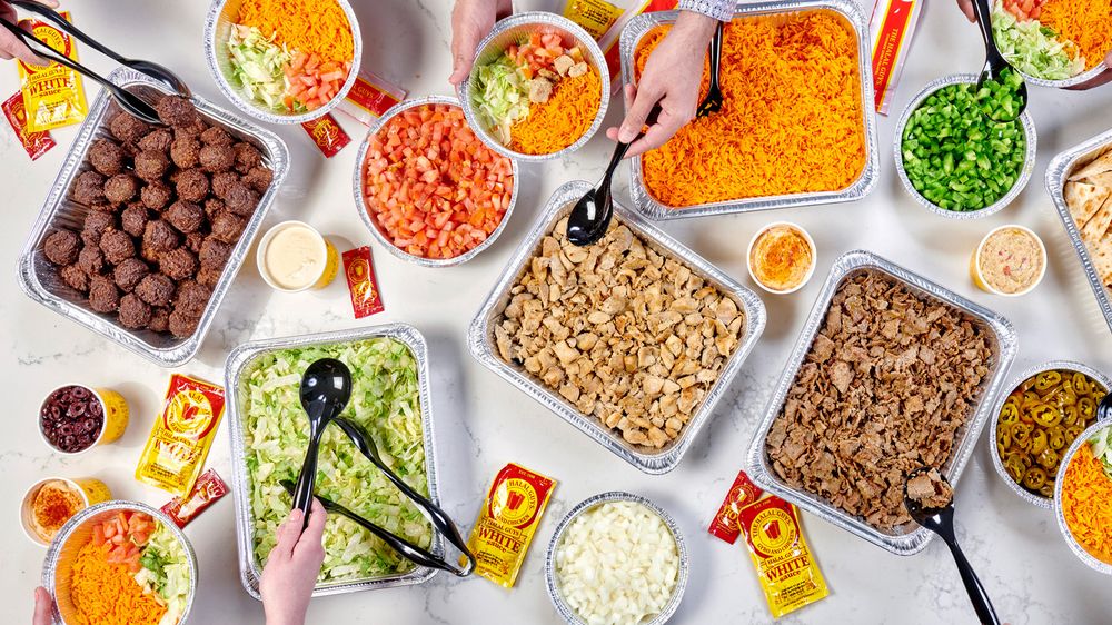 Serves 4-5 people.Choose a Protein or Protein Combo. Accompanied by Basmati Rice (30oz), Lettuce (12oz), Tomato (8oz), Warm Pita (16 slices), Onions (4oz), Green Peppers (4oz), our World Famous White Sauce (10 packets), and Fiery Hot Sauce (5 packets).
